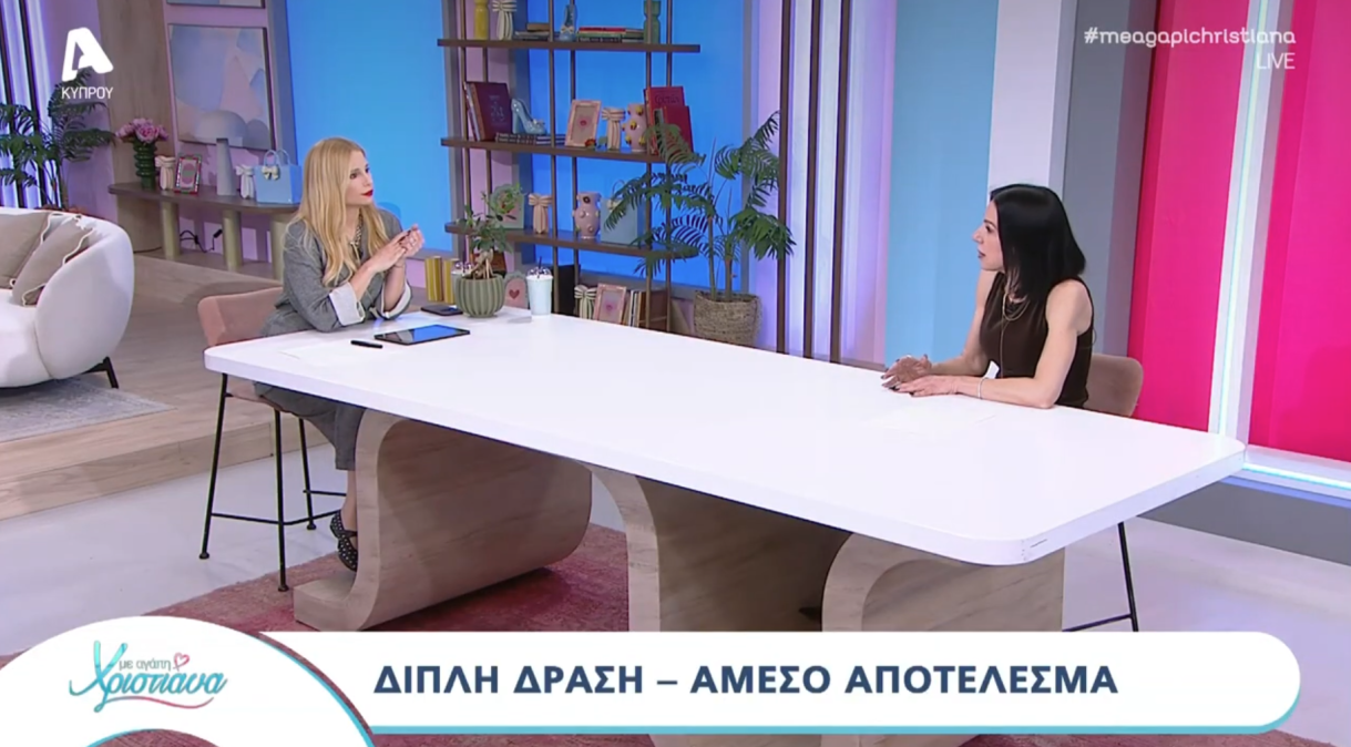Η Νίκη Μέγα Κλινική Ψυχολόγος/Ιατρ. Συμβ. Πλαστ. Χειρουργικής Advanced Aesthetics καλεσμένη για άλλη μια φορά στην εκπομπή «Με αγάπη Χριστιάνα» στο Alpha Cyprus μιλάει την επαναστατική μέθοδο μεσοθεραπείας που κερδίζει τις εντυπώσεις και αλλάζει τα δεδομένα. Ανακτήστε το χαμένο χρόνο χωρίς ενέσιμο με ένα μοναδικό υλικό που περιέχει 3 διαφορετικά είδη υαλουρονικού και χαρίζει αποτέλεσμα